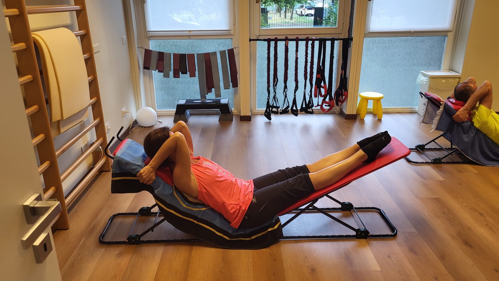 L’allungamento muscolare, in sinergia con una respirazione diaframmatica avviene senza compensi grazie all’utilizzo di una panca brevettata con snodo regolabile in diverse posizioni ed utilizzata in abbinamento a vari accessori (cinghie, elastici, palline, cuscinetti).